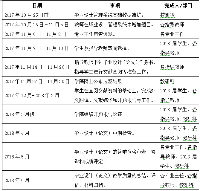 六、 时间安排。11月30日前完成毕业设计(论文)选题工作,具体时间如下: