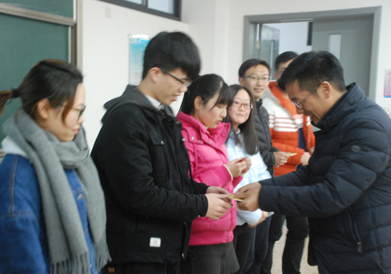 党委副书记史正东向考研学生代表发放慰问品并发表讲话。他对在座每位坚持到现在的考研学生表示高度赞扬,他讲到,考研不仅是实现梦想的途径,更是锤炼自己的好机会,因此不论成败,都将是一次毕生难忘的宝贵经历。史老师提出,考生们应该在剩下一周的时间内做好三个准备。第一,学业的准备。他建议同学们应该在剩余的一周时间里系统梳理四门课程的知识,合理安排时间,建构系统化的并且适合自己记忆的框架;第二,身体的准备。身体是最基本的,他叮嘱考生们最近天气骤冷,要注意保暖,多喝开水,还应劳逸结合,调节好自己的身体;第三,心理的准备。史老师提醒大家考前不能太紧张当然也不可过于放松,应该根据自己的个性特点找到平衡统一点,给自己一点放松的时间,如适度的有氧运动,绽放笑容,考前深呼吸等,从外部消除自己内在的紧张情绪。