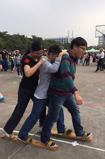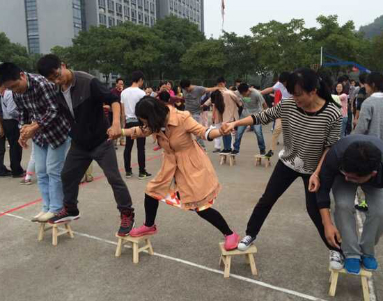 下午1点10分,南山校区篮球场上人头涌动,参加比赛的教职工已早早到场准备,学院党委书记楼智美等院领导也到场加油助威。最先开始的项目为板凳接龙,色花堂