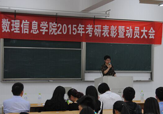 2015年考研表彰暨动员大会在南山综合楼A203举行。学院党委书记楼智美、党委副书记史正东、各学科主任、各专业考研管理导师、2012级各班主任、学生科辅导员、2011级考取硕士研究生的25位同学以及2012级参加考研的学生、2013级和2014级有考研意愿的同学共200余人参加大会。大会由学院党委副书记史正东主持。