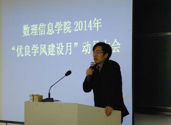 发起此次学风建设月活动的前期调研准备工作和活动开展背景作了详细介绍。他在讲话中指出:此次学风建设月活动开展,引导同学们崇尚学习是基于解决当前学业预警学生增多等问题的迫切需要;同时也是学生工作的自身需要;更是共建绍大的需要,是每位同学的使命、担当和责任。最后,史书记就本次优良学风建设月活动的开展给全体同学提了三点要求:一是要统一思想,充分认识优良学风建设的重要意义;二是要明确活动的要求,希望大家以主人翁的意识参加活动,争取在此次活动中每位同学都有收获;三是希望同学们遵守活动的要求和纪律,学生干部和学生党员要在活动中带头表率。