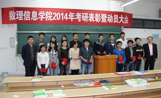 召开2014年考研表彰暨动员大会,对成功考上硕士研究生的20名学生予以表彰奖励,并对2015年考研工作作了进一步的动员和部署。学院党委书记王建平、党委副书记朱良以及学生科相关负责人出席大会。