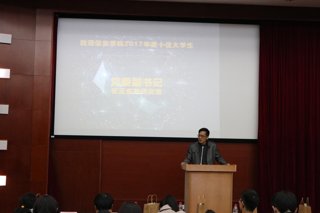 评选会的最后,学院党委副书记史正东老师为他们一一颁奖祝贺并对此次活动进行了精彩点评。他首先鼓励和表扬了参与此次活动的所有候选人以及工作人员的辛勤付出。其次他对于各位候选人的台风进行了点评。他指出,我们同学的台风很稳,能够很自然的表现自己的优势,比如物理161班的童一诺同学、数学141班的丁丹琦同学等。史书记指出,将来学院会营造更多的机会,打造更大的平台让大家更好锻炼自己能力,提升展示水平。他强调,色花堂