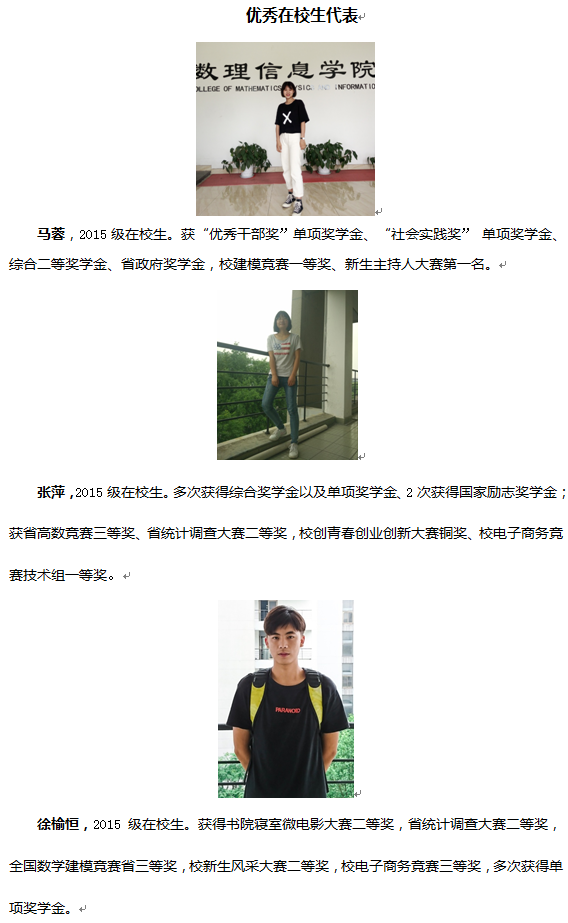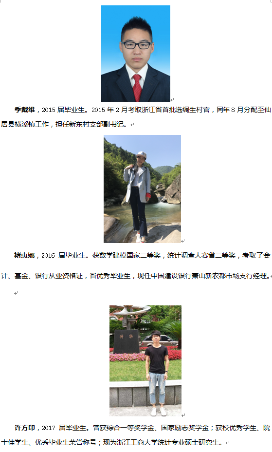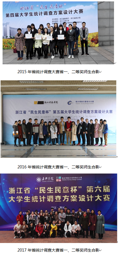 近年来,本专业教师在指导学生参加学科竞赛方面,取得了丰硕的成果。全国大学生数学建模竞赛中共获得省级及以上奖项100多项,其中国家级10多项。浙江省大学生统计调查大赛中共获得省级奖项40多项,其中省一等奖6项。特别是在2017年省统计调查大赛中,我校共获得省一、二、三等奖各1项、8项、1项,成绩位于全省高校前列。电子商务竞赛共获得省级及以上奖项15项,其中国家级1项。