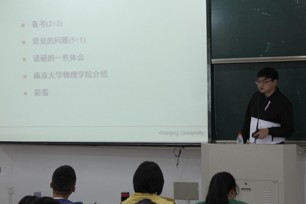 在6号楼A207召开优秀考研校友专题讲座。本次讲座特邀已考取南京大学研究生的物理131班知名校友骆叶成同学主讲,骆叶成同学现正在南京大学继续攻读博士学位,他为即将考研以及对考研有意向的同学带来了一场精彩的考研经验分享。