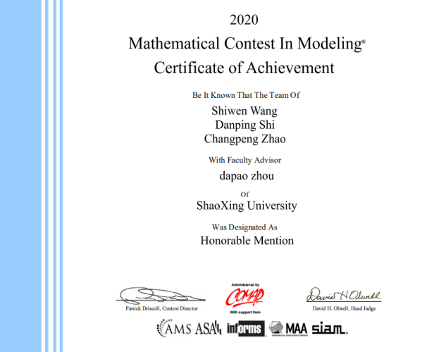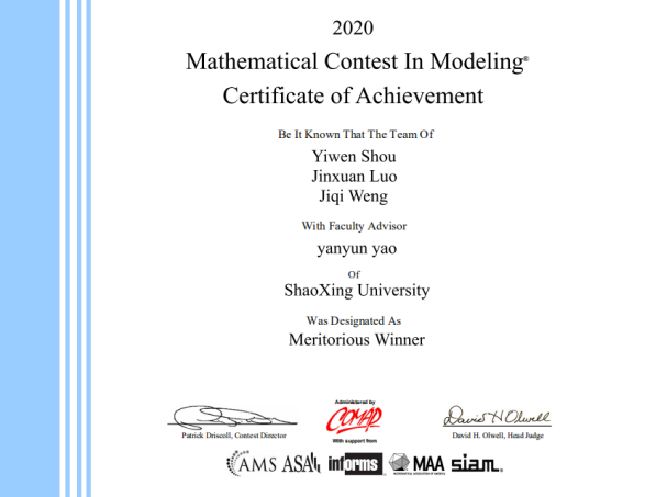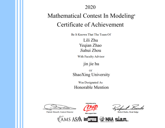 近期,2020年美国大学生数学建模竞赛(MCM/ICM)结果揭晓,绍兴文理学子获得Meritorious Winner奖2项,Honorable Mention奖3项。这是继我校2019年在该赛事上取得的又一次优异成绩(2019年获得Meritorious Winner奖2项, Honorable Mention奖2项)。