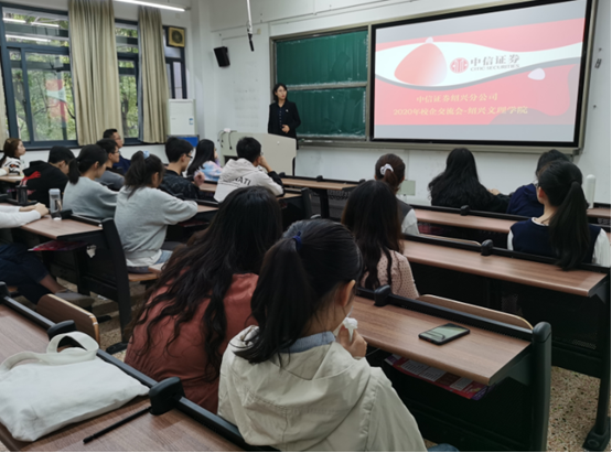 11月19日下午,中信证券绍兴分公司部门主管傅舟丹,人事部副总经理李萍一行来到综合楼,为同学们介绍了财务配置的有关知识,如何进行个人财富管理,使同学们了解到风险和收益并存,关键要合理配置资源。