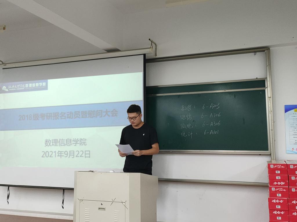 在综合楼A203教室召开了2018级考研报名动员暨慰问大会,学院党委副书记庞飞、各专业考研团队导师组组长、辅导员、全体2018级考研学子出席了本次大会。