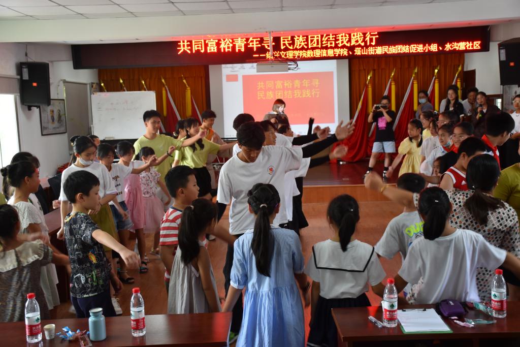 7月5日、6日上午,实践团分别前往越都社区和水沟营社区,开展汉藏文化交流交融活动。实践队员参观完社区建设后向社区居民及中小学生从藏族美食、旅游景点、藏族服饰和藏族语言四个方面进行藏族文化展示。实践团成员通过讲解、视频展示、品尝藏族特色食品、学习藏族敬酒礼仪、学习简单的藏语、试穿藏族特色服饰、表演藏族舞蹈等方式,让社区居民亲身尝试体会民族特色文化,在场的居民和学生们纷纷赞叹藏族文化的博大和奇妙。在欢快的音乐和自由的舞蹈中,在场的藏汉两族同胞都真切地感受到汉藏一家亲。活动的最后在一片热闹而愉快的氛围中,队员和观众互道“扎西德勒”。
