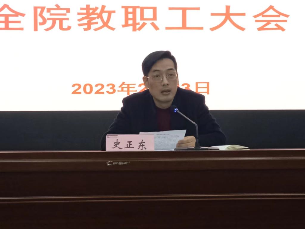 党委书记史正东传达新学期全校干部大会精神,并部署2023年学院党建和思想政治工作。他强调,今年学院要深入实施党建“四个融合”行动,创新基层党建工作,扎实推进“双带头人”党支部书记工作室建设,以党建统领校政企合作、产教融合,争创“校地党建融合”和“助力共富,科教先行”示范学院。不断压实意识形态工作责任,建立预警管理长效机制。制定《意识形态工作责任制任务清单》,落实意识形态工作责任分解任务,健全意识形态工作研判机制,形成意识形态领域风险预警体系。要进一步做好人才引育工作,建立人才服务保障机制。坚持人才引领学院发展的首位战略,拓展引才渠道,实现精准施策、精准引才。