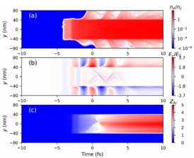 图1偏振轴上特征量随时间的演化(a)电子密度(b)横向场电场Ey(c)氩原子的电荷态Z