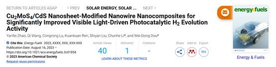 李春鹤副教授和窦卫东教授指导的物理学专业191班本科生赵艳菲、汪琪以共同一作在ZJU 100期刊《Energy & Fuels》(IF : 5.3)上发表题为《Cu2MoS4/CdS Nanosheet-Modified Nanowire Nanocomposites for Significantly Improved Visible Light-Driven Photocatalytic H2Evolution Activity》的论文。《Energy & Fuels》期刊创刊于1987年,已被国际重要权威数据库SCI、SCIE收录,期刊聚焦工程技术-工程:化工领域的重点研究和前沿进展。
