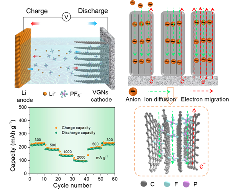 本研究针对双离子电池传统石墨正极面临的储阴离子过程高扭曲路径所导致的传质不均匀及缓慢反应动力学的瓶颈问题,首次报道了直立取向性石墨纳米片结构用于定向输运阴离子,垂直开口的石墨结构通过定向的和缩短的离子通道,调节了均匀离子梯度和电场,实现了快速阴离子扩散。同时,有序孔道结构缓冲了阴离子插层体积膨胀,提高了结构稳定性。最终基于直立石墨纳米片正极的双离子电池实现了高容量高倍率超长寿命循环性能。该研究为纳米材料高效储能提供了新思路。