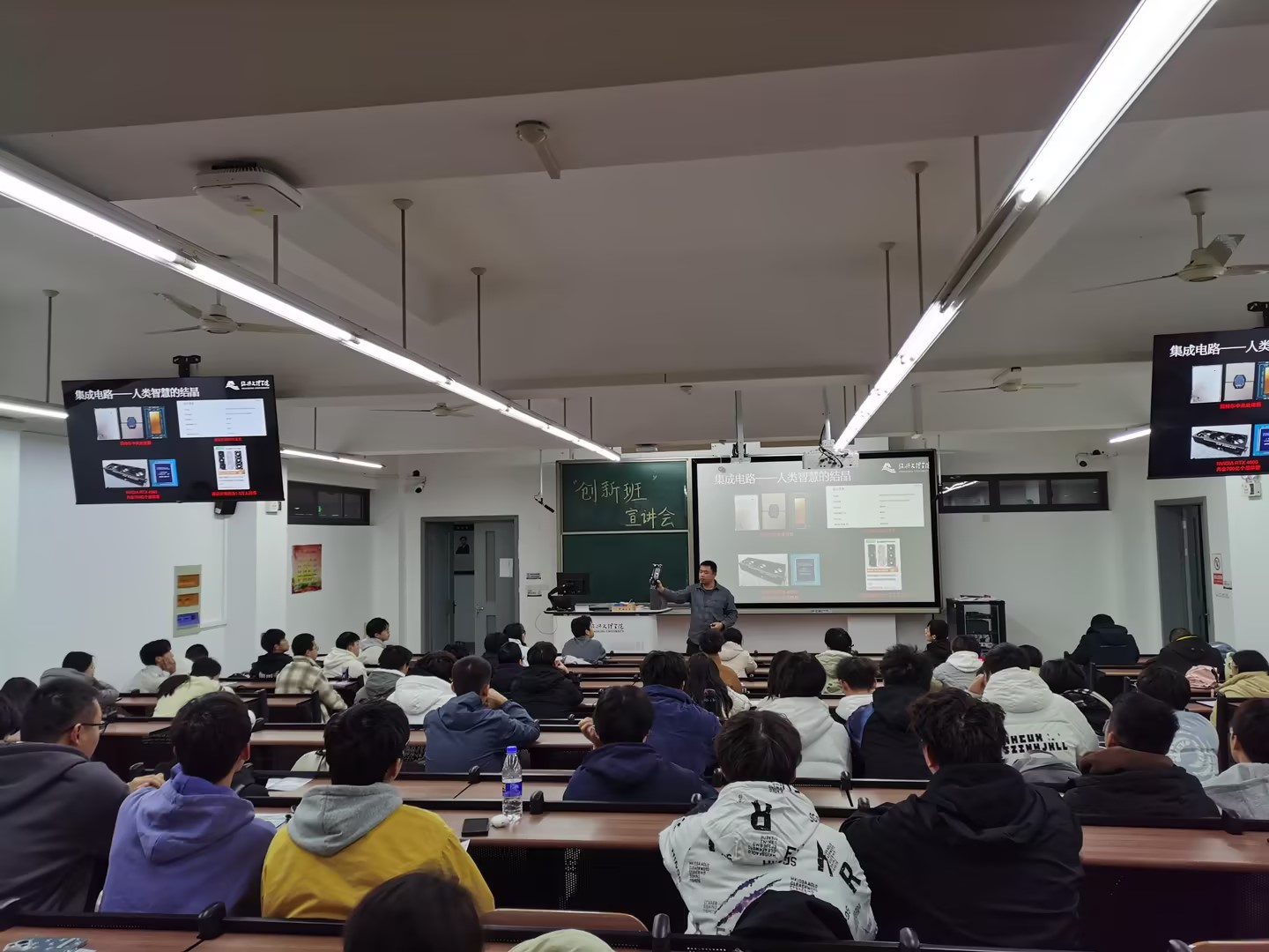张教授向全体新生详细介绍了“创新班”的设立目的与意义,强调了其在学校发展中对于创新型人才培养的重要性。他指出,“创新班”是学校为培养集成电路高端人才而设立的精英工科试验班,旨在选拔具备较强综合素质和强烈创新意识的科研人才,并通过专业课程的小班化教学和导师制培养,以及丰富的软硬件条件支持,帮助“创新班”学生实现个性化和综合发展。