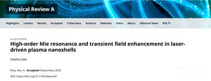Xiaohui Gao, “High-order Mie resonance and transient field enhancement in laser-driven plasma nanoshells”, Phys. Rev. A (Accepted 8 December, 2025).