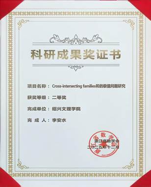 李安水老师的科研成果(该成果主要与张华军教授合作完成),凭扎实理论、创新视角及应用潜力获浙江省数学会科研成果二等奖,为学校数学科研添彩。