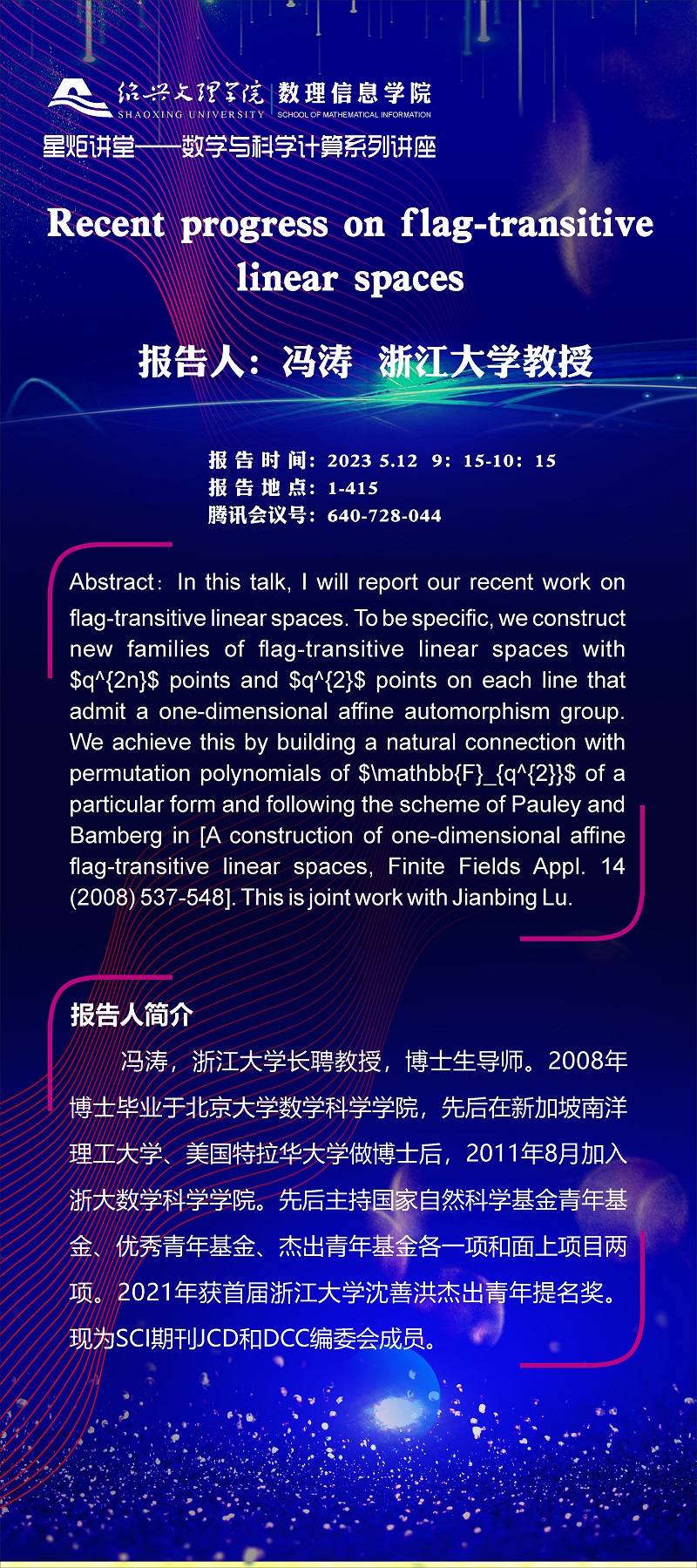 浙江大学 冯涛教授:Recent progress on flag-transitive linear spaces