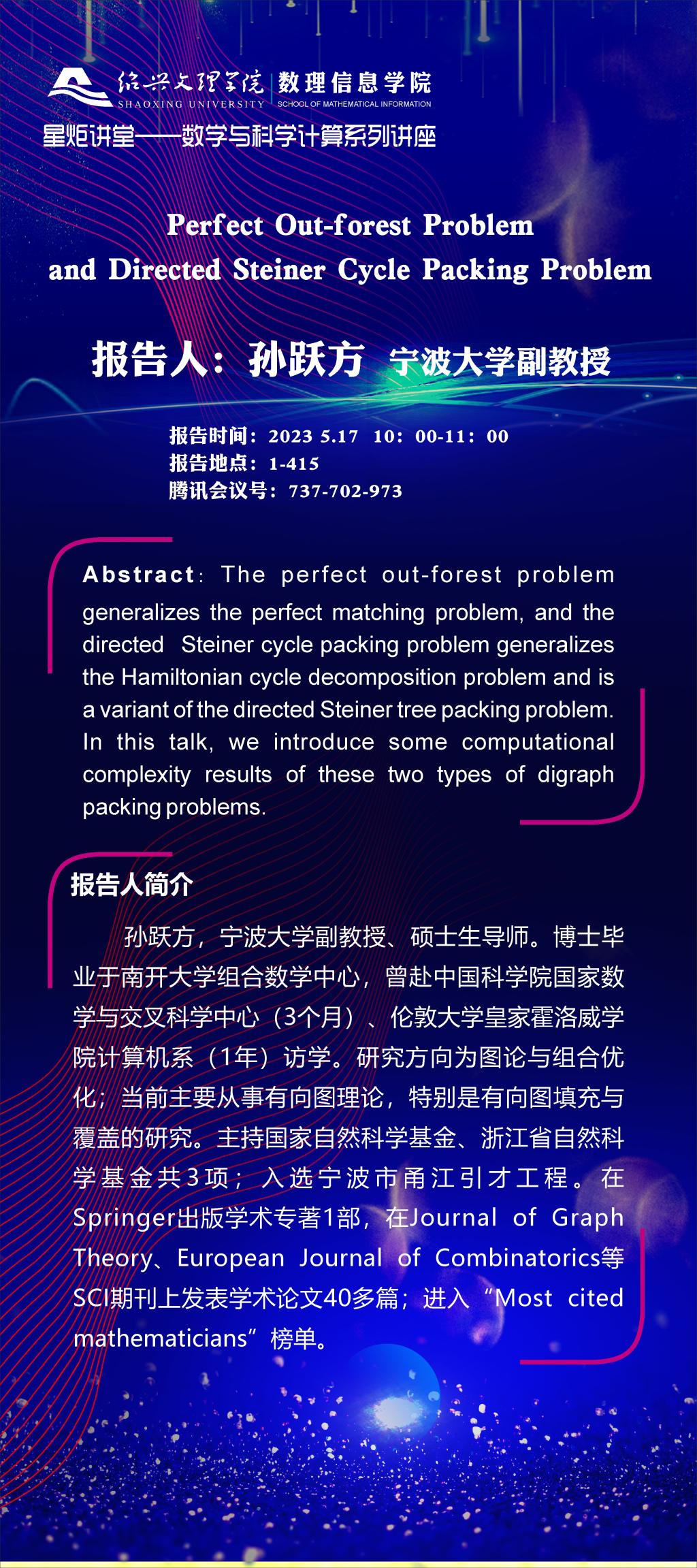 宁波大学 孙跃方副教授:Perfect Out-forest Problem and Directed Steiner Cycle Packing Problem