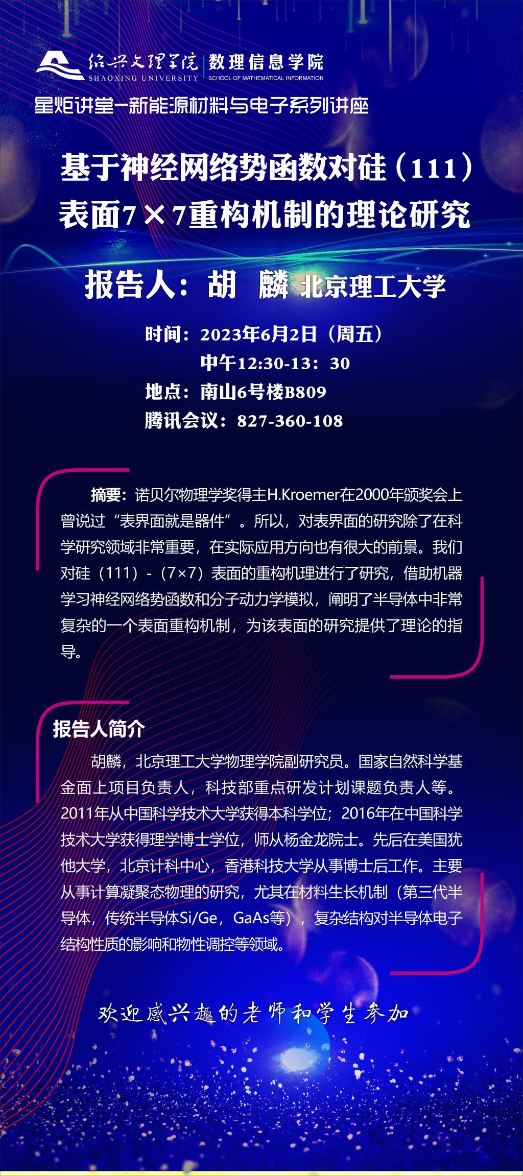 北京理工大学 胡麟副研究员:基于神经网络势函数对硅(111)表面7*7重构机制的理论研究