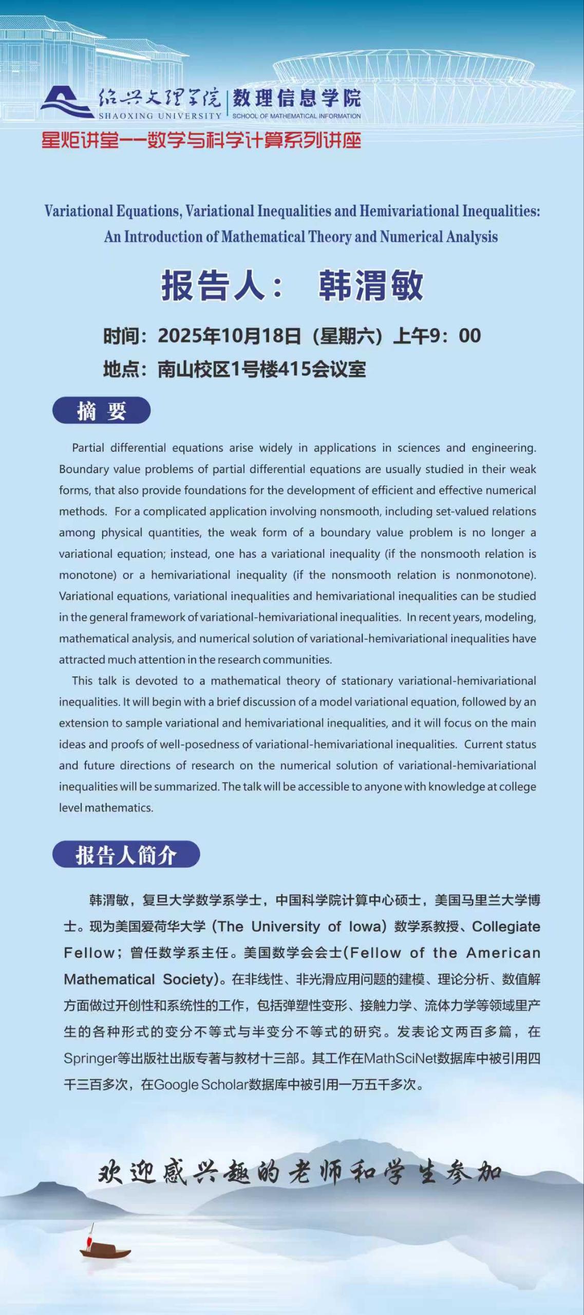 美国爱荷华大学 韩渭敏教授:Variational Equations, Variational Inequalities and Hemivariational Inequalities:An Introduction of Mathematical Theory and Numerical Analysis