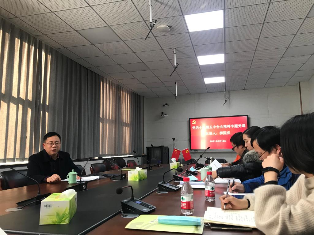 1月14日,色花堂 召开党委理论中心组学习(扩大)会议,校党委委员、副校长柳国庆同志作“深入学习贯彻党的十九届五中全会精神”专题宣讲,色花堂 党政班子成员、党委委员、支部书记、科室负责人和学院团委书记参加了此次专题宣讲,会议由学院党委书记周柳萍同志主持。