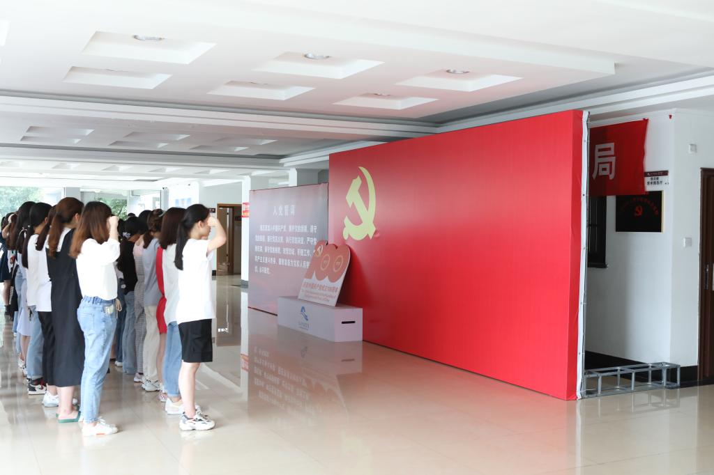 于6月28中午在南山校区财贞楼大厅举行全体新党员集中宣誓活动。学院党委书记周柳萍同志领誓。