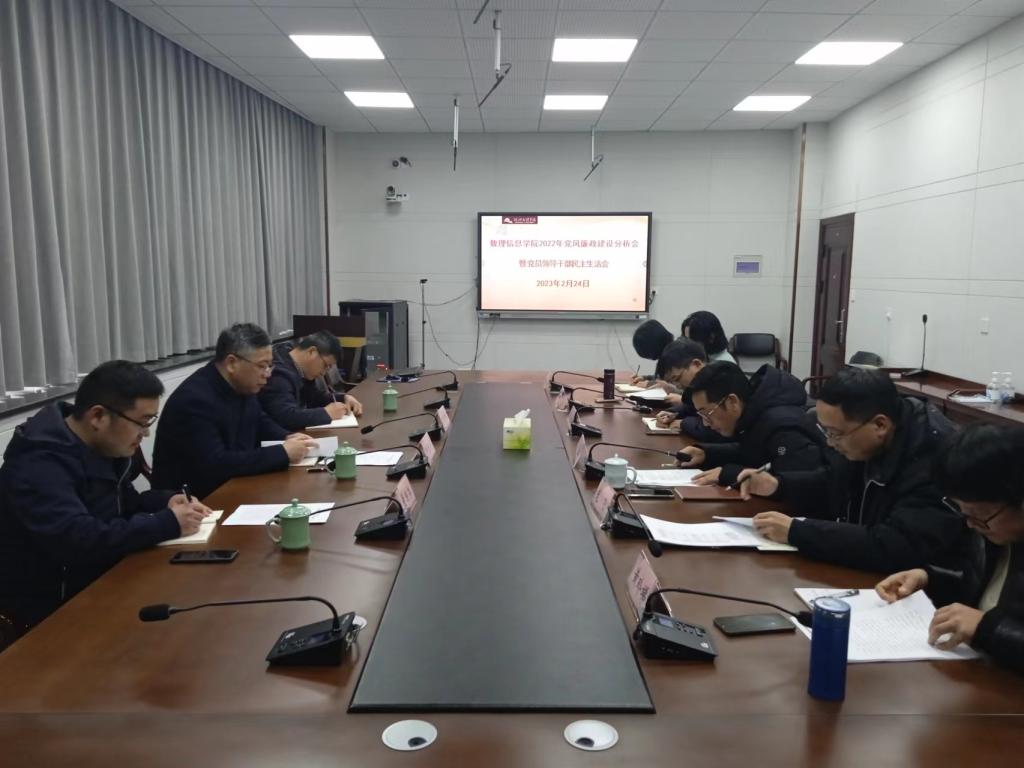 在415会议室召开2022年度党风廉政建设分析会暨党员领导干部民主生活会。校党委委员、副校长柳国庆,校纪委委员、审计处处长孙朝阳等到会指导。学院全体领导班子成员、党委委员参加会议。