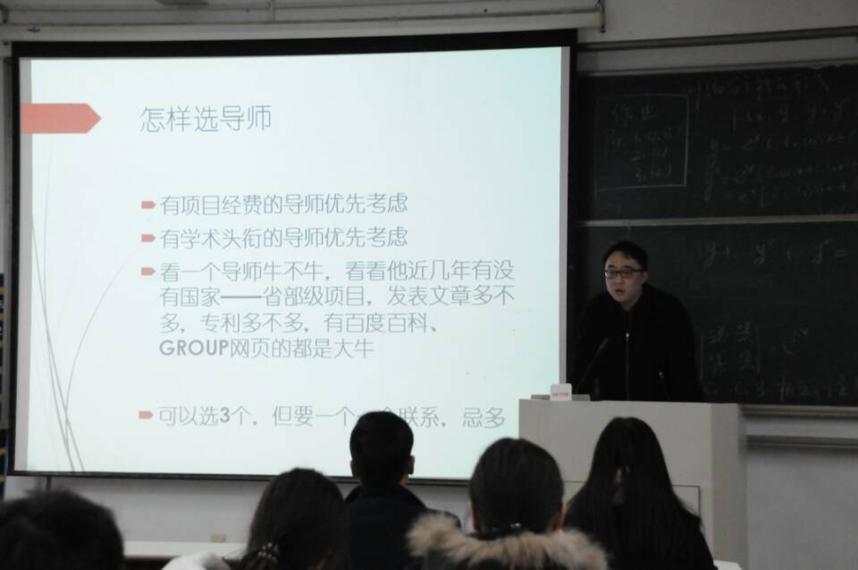 讲座在大家的全神贯注的倾听中和此起披伏的笑声中进行。姚博老师首先生动的告诉大家联系导师不是坐等分数线出来再说,而是“初试时间公布就能联系!越早越好!国家线出来就晚了!”其次关于选导师首先要先考虑有项目经费的,有学术头衔的导师,那些有百度百科,GROUP网页的导师都是大牛!在怎样联系方面,姚博老师推荐的是发邮件——打办公室电话——亲自拜访。接下来,姚老师又阐明了“套磁信怎样写”的7个写作要点,并以三个优秀套磁信范文结束了此次讲座例子。