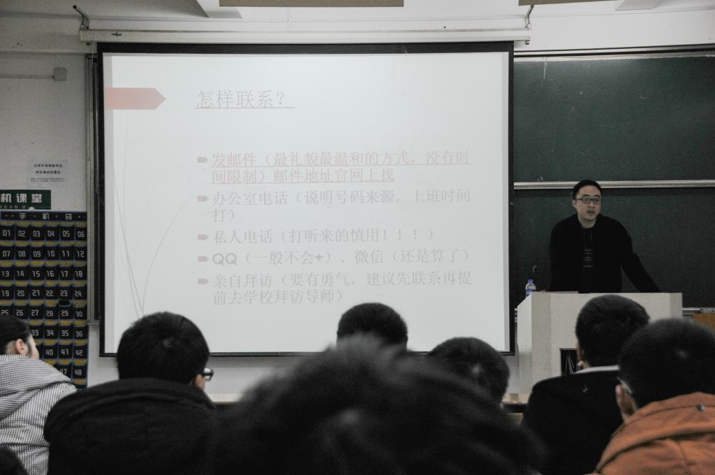 另外姚博老师结合自己的经验给同学们在联系导师的方式上提出了几点建议:老师认为发邮件是最礼貌最温和的方式,最好用自己真实姓名的拼音申请网易等邮箱发送自荐邮件,会给导师留下好印象,同时也要注意尽量不要使用QQ邮箱。如果需要拨打办公室电话时,选择在导师上班时间拨打,并且最好说明号码来源,最佳联系时间为上午9:00-10:30,下午15:00-16:30,如果要拨打老师的私人电话需要慎重。如果条件许可,最好可以本人亲自拜访,带上一定的伴手礼表示尊重。