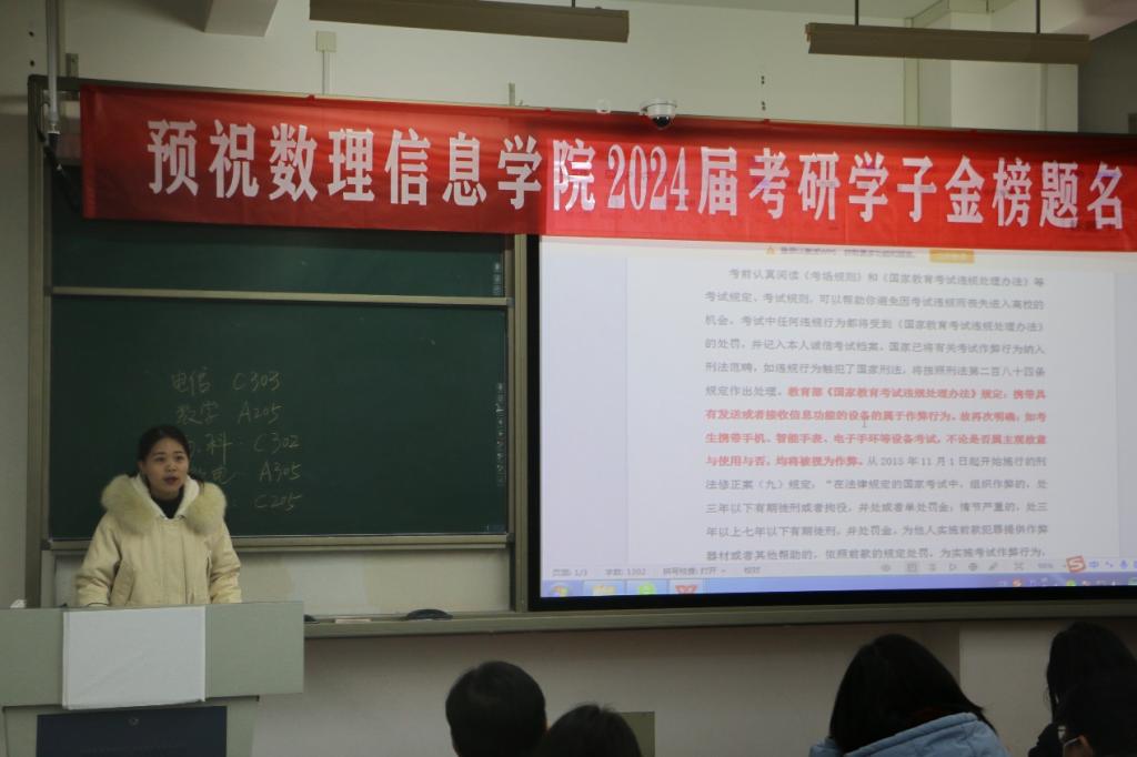 随后,杜美霞老师对考研学子进行诚信考试教育,全体考研学子观看了诚信考试教育视频,签订了诚信考试承诺书,杜老师还为考生们讲解了考生须知、考场安排、考试注意事项等。