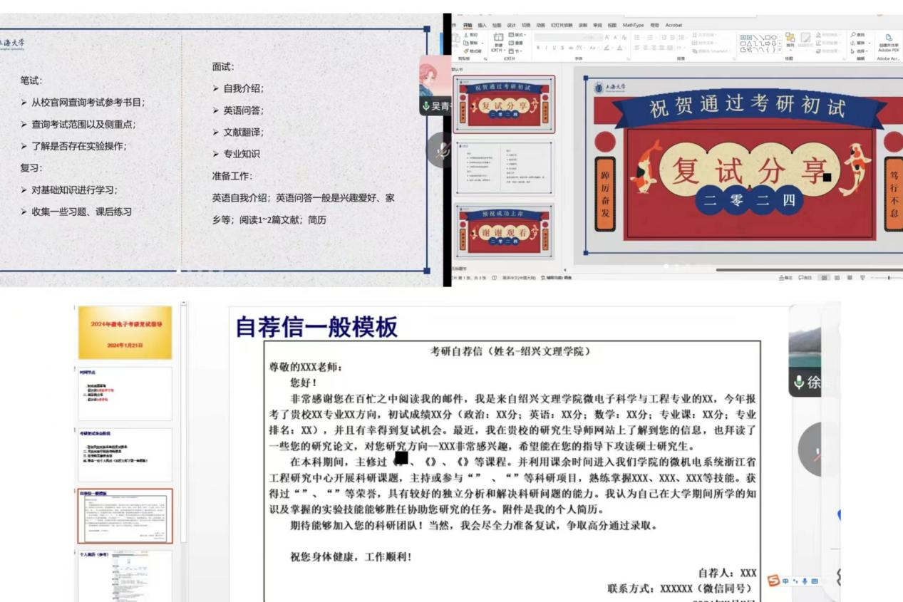 首先由四位学长进行复试的经验分享。录取上海大学集成电路科学与工程专业、原微电191吴青书学长分别从笔试与面试的角度展开,笔试方面从校官网上查询考试参考书目和考试范围,复习上着重于基础的夯实和重点的突破,对真题有一定的了解,面试方面学长提及由四部分构成:自我介绍、英语问答、文献翻译、专业介绍,可以进行一定的准备工作:熟练准备一篇英语自我介绍;从面试小组中找1-2篇文献试着进行翻译;将自身简历丰富化,例如:科研经历,项目成果及参与的竞赛;对选择的院校有充分的认识。