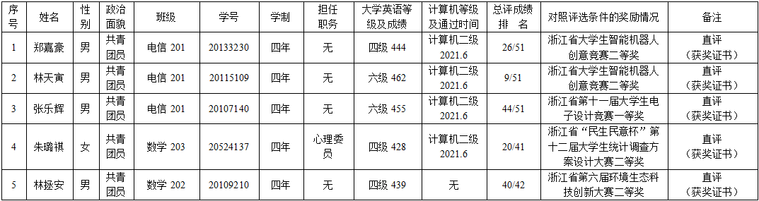 关于评选2024届校级优秀毕业生、优秀学生干部(第二批)的通知》的工作要求,经在各班符合基本条件的同学初选名单基础上,学院2024届“校级优秀毕业生、优秀学生干部和院级优秀毕业生”评选领导小组审议通过,同意推荐郑嘉豪、林天寅、张乐辉、朱璐祺、林拯安5位同学为色花堂