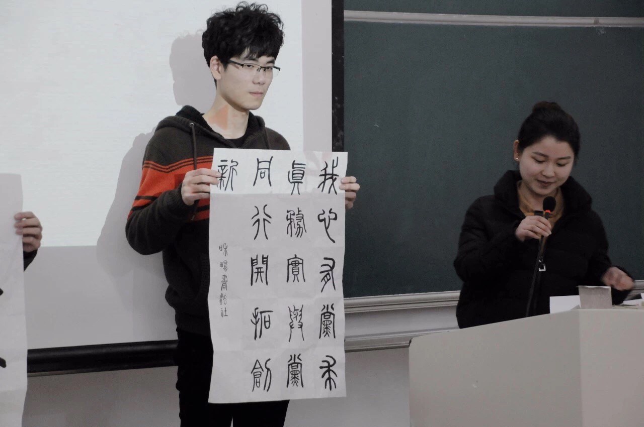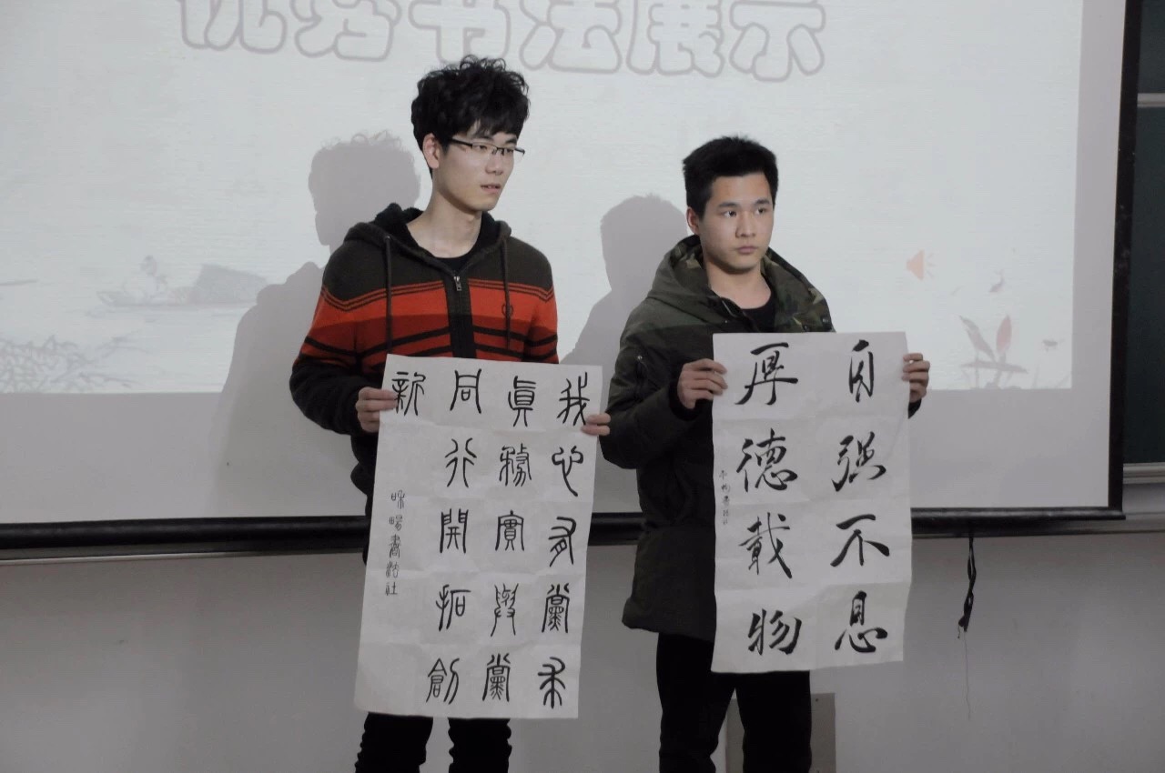本次团课授课的方式与以往不同,我们邀请了书法社社长汪银菲同学为我们讲述了古时的革命精神,以及书法与改革创新的渊源。为了使我们更好的理解本次团课的主题,书法社的同学们通过书法作品展示了他们对于革命精神的理解。
