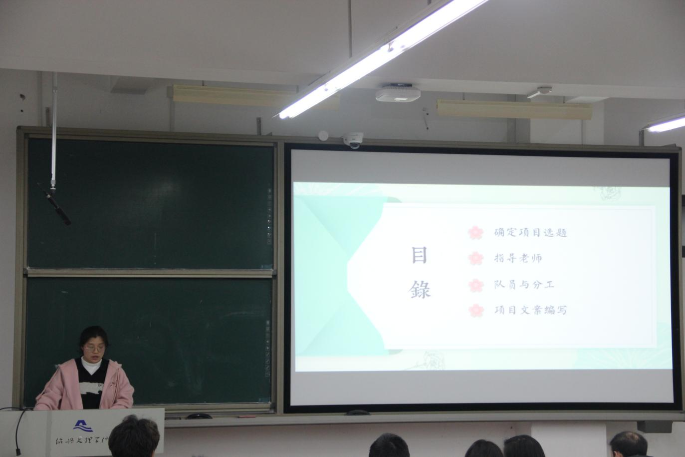 第3位分享人陈玮洁,科教201班,曾获电商、物创、机器人竞赛省二等奖,拥有校级项目《防疫安全卫士——基于机器视觉的人脸识别和口罩检测系统》。她分享到:一个项目首先是要确立项目选题,大家可以根据时代大背景下的时事热点现象确定选题,也可以是日常生活中观察到的一些切实具体的社会痛点难点问题,也可以查看学校学院前几年成功立项的选题,观察特点,总结规律。在确定大致方向后,尽可能多的查看相关资料论文,可以对资料内容进行梳理。除此之外她也鼓励大家有问题多问老师,以及找到合适的队友。最后她细致地分享了关于申报书的撰写工作。