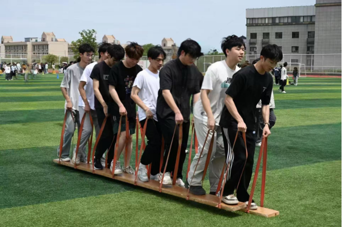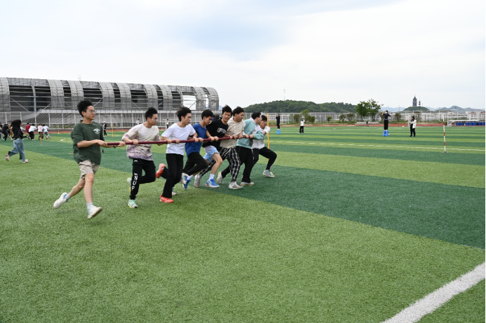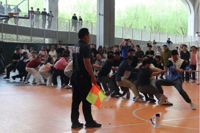 接着是力量的比拼,拔河项目。以团结协作的精神和奋勇拼搏的姿态,诠释集体荣誉的力量。随着裁判哨声响起,同学们紧握麻绳、扎稳马步,瞬间迸发出强劲的拉力。场边啦啦队情绪高涨,挥舞着旗帜、呐喊助威,加油声浪此起彼伏。作为最具凝聚力的传统项目,拔河比赛不仅展现了同学们的昂扬斗志,更让“拧成一股绳”的团队精神在赛场上熠熠生辉。