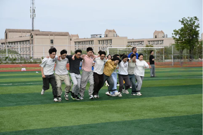 最后是十人十一足项目,也是本次运动会新加的项目。队员们用绑带相连双脚,以整齐划一的步伐诠释团队协作的力量。随着发令枪响,参赛队员们齐声高呼口号,绑在一起的双脚化作“钢铁之足”,迈着整齐有力的步伐向终点冲刺。赛场上,默契十足,从起步便展现出惊人的协调性,如离弦之箭飞速前进。场边观众的加油声浪此起彼伏,紧张氛围不断上升。十人十一足项目以独特的竞技形式,让同学们在“同频共振”中体会到团结的力量,成为校园里一道充满活力的风景线。