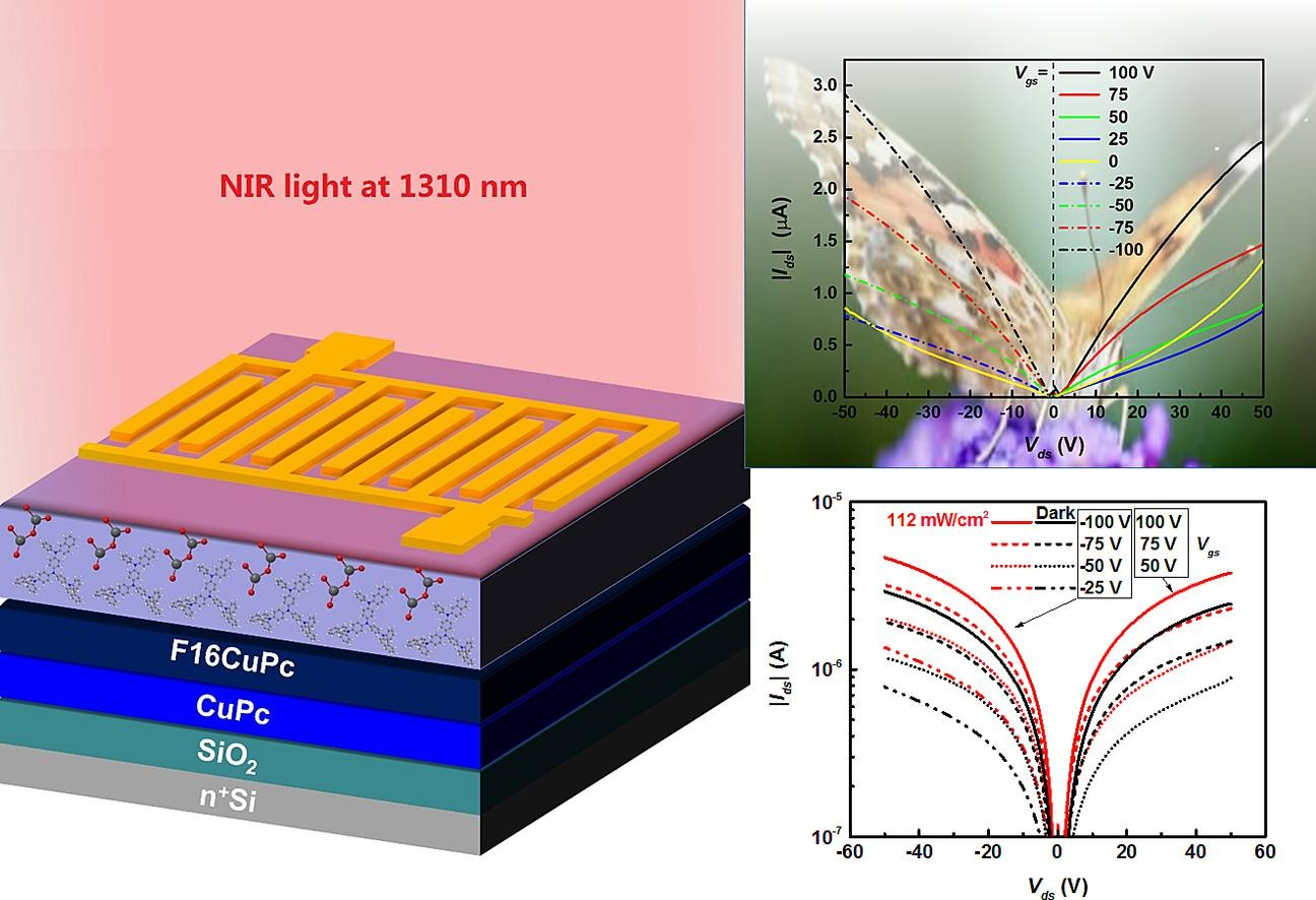该论文阐述了一种基于有机-无机的新型非制冷半导体红外探测器的构筑策略。通常,有机半导体红外探测器工作在1000nm以下,这是由于缺乏对红外光敏感的窄带隙半导体材料。鉴于此,姚博课题组提出了一种利用有机平面异质结沟道层和有机-无机电荷转移复合物光敏层的新策略,可有效拓宽探测器的工作波长,并成功制备出在NIR-II区(1100-1400 nm)工作的双极型有机光敏晶体管。这项工作在我校微机电系统浙江省工程研究中心完成,并与中芯集成(SMIC)、电子科技大学、福州大学等多家单位合作,受到国家自然科学基金、浙江省基础公益研究计划和绍兴市“揭榜挂帅”重点项目的资助。该成果将有助于双极性红外光传感器的设计,并提出了未来实现光学互补MOS逻辑电路的设计思路。