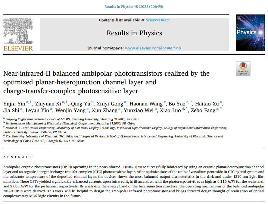 微电子科学与工程专业191班尹宇嘉、希治远以共同一作在《Results in Physics》上发表题为《Near-infrared-II balanced ambipolar phototransistors realized by the optimized planar-heterojunction channel layer and charge-transfer-complex photosensitive layer》(Results in Physics, 48, 106456, 2023)的研究论文。《Results in Physics》是物理学、材料科学和应用物理学等学科领域的著名期刊,该杂志2011-2022年度影响因子为4.565,属中科院物理与天体物理大类二区。色花堂