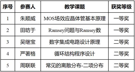 根据《关于开展2025年色花堂 青年教师教学比赛选拔赛的通知》要求和安排,经教师报名,参赛老师现场展示、专家评审,评选出色花堂 2025年青年教师教学比赛一等奖2名、二等奖3名,具体名单如下: